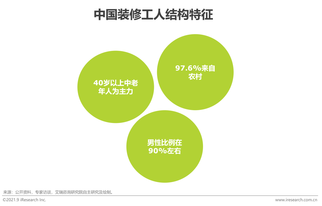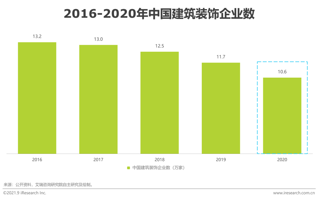 住宅装饰和装修行业属于建筑装饰业下的细分子行业,主要作用在于美化居住环境和提高住宅功能性,在同一住宅生命周期内可发生多次装修行为,使得家装行业具备可持续性的特点,市场空间巨大。中国建筑装饰协会统计数据显示,2020年中国建筑装修行业企业数量为10.6万,呈逐年递减态势,退出市场的企业以低资质小公司为主;但与此同时家装企业集中度极低,龙头企业营收均未过50亿,市占率都低于1%。究其原因,家装行业服务端从早期的施工队、设计工作室,发展至装修公司,期间产生了升级更迭但绝非完全替代。时至今日,传统家装企业数量多且较为分散,区域型特征明显,缺乏统一的标准化施工流程,导致行业集中度较低。
