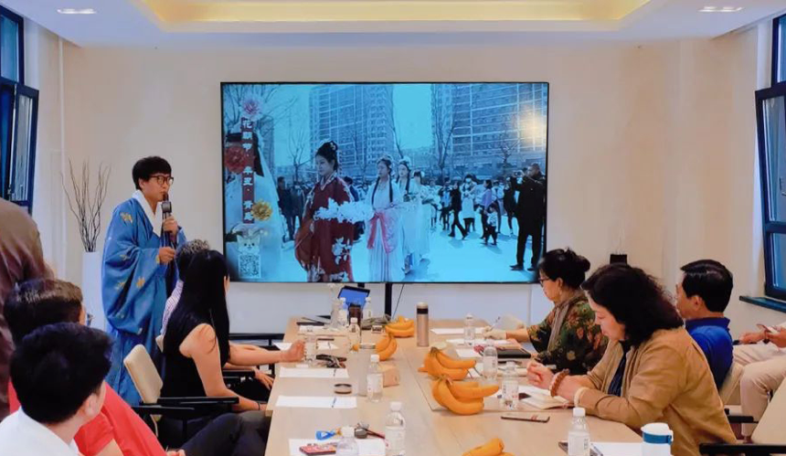 青岛百川取则文化有限公司总经理孙一之带领参会者穿越朝代,领略汉服文化。