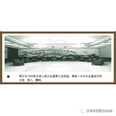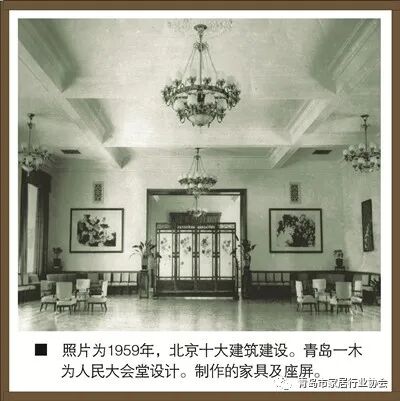 七、1959年春,山东省人民政府决定由青岛第一木器厂承担人民大会堂宴会厅和山东厅家具制作任务,作为重大的政治任务,受到高度重视。历时7个月精心设计,制作了34个品种,共1916件,高档家具和工艺装饰品,由副厂长邢秉德带领10余名精兵强将前往北京安装,受到了周总理等老一辈领导人的好评。