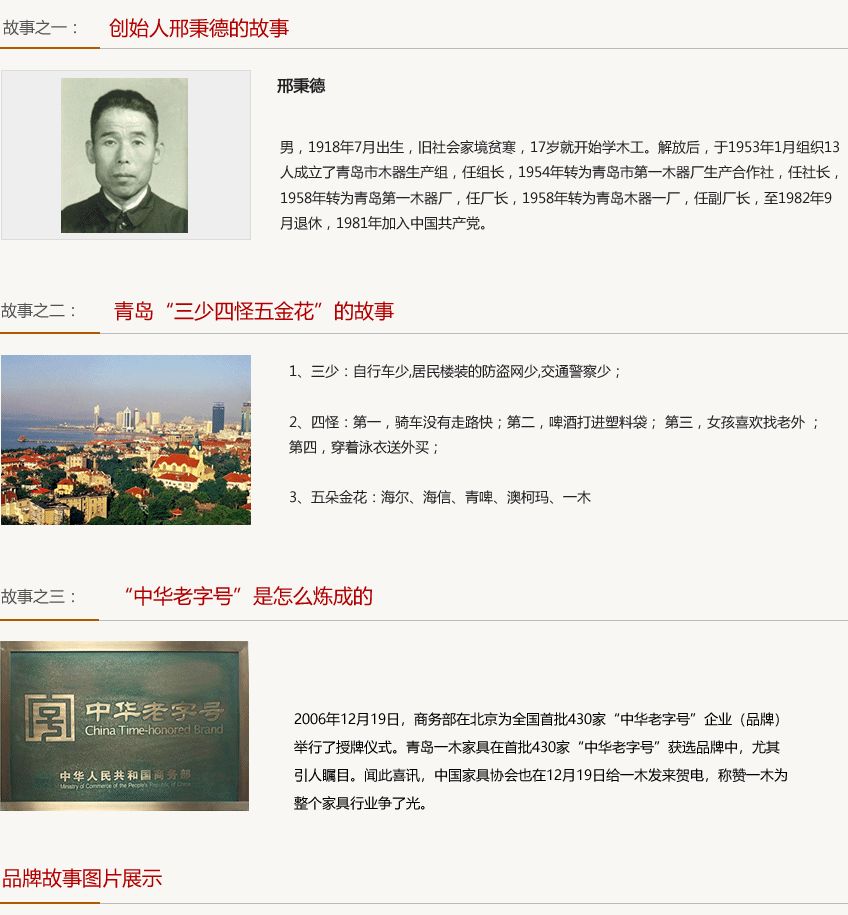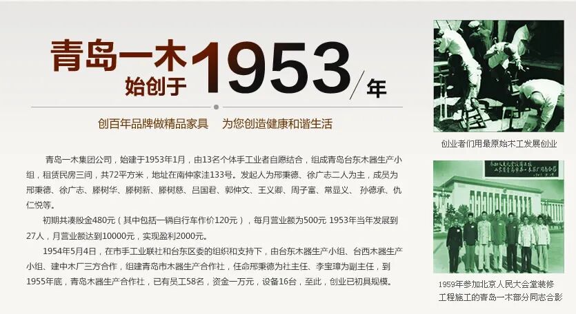 青岛一木集团有限公司始建于1953年,前身为青岛木器一厂。60多年来,企业曾多次荣获国家及省市权威部门颁发的各种奖励和荣誉,曾为北京人民大会堂等中央、省、市各级政府1000多个项目配置过各类家具。一木的产品,装点了几代人的家庭,成为消费者心中信得过的传统品牌。1989年,荣获青岛市首批”金花”产品称号,2006年,被国家商务部评为中国家具行业唯一的“中华老字号”企业,是中国家具行业享誉多年的龙头企业。