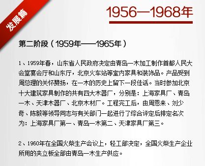 八、借搬迁改造,为人民大会堂制作家具契机,这段时间,企业的规模、技术、设备、工艺创新进入了一个快速发展时期,并奠定了青岛一木在同行业中的领先地位。1959年,国家轻工业部确定青岛一木生产的夹立板为全国重点生产厂家,产品纳入国家计划(轻工业部调拨木材)。1960年全国火柴会议上,轻工部决定全国所有厂家所用夹立板全部由一木生产供用。