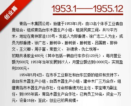一、1953年1月,由13名个体手工业者自愿结合,组成青岛台东木业生产小组,租赁民房三间,72平方米,地址:台东南仲家洼133号,资金480元,设备(工具)10余套。创始人:邢秉德、徐广志、滕树华、滕树新、滕树慈、吕国君、郭仲文、王义卿、周子富、常显义、孙德承、仇仁悦、徐某(共13人)。