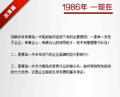 十八、1985年,青岛木器一厂被轻工业部列为板式家具生产线引进项目样板企业之一。本年度工业总产值为2452万元,实现利润240万元,企业处于全盛时期。