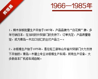 十五、1975年,在轻工部和山东省外贸部门大力支持下,一木建立冰糕棒生产车间,所有设备,自我研制生产,当年11月投产,产量逐年递增,并行销日本、欧洲各国,成为一木的又一支柱产品“雪花牌” 冰糕棒。