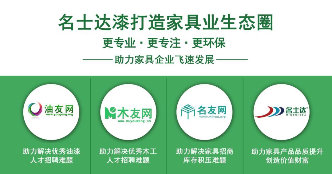 围绕“打造家具业生态圈”的品牌定位,为客户提供产品以外的大量增值服务又是名士达的一大亮点。以“油友网”、“木友网”、“名友网”等网络媒体的成立为基础,名士达不仅为家具企业供应优质原材料,在生产、销售工作上也提供了重要助力。从解决家具销售到助力客户招商,从“名士达慈善联盟”对客户的爱心帮扶到“漆谷大学”提供的增值培训服务,以及“油友云购”的一站式采购、“设备补贴”政策等等,以更周到、深入的服务为客户创造价值。