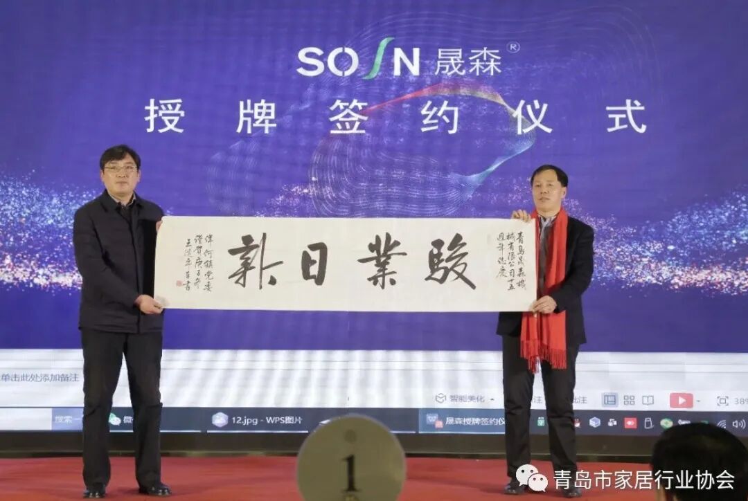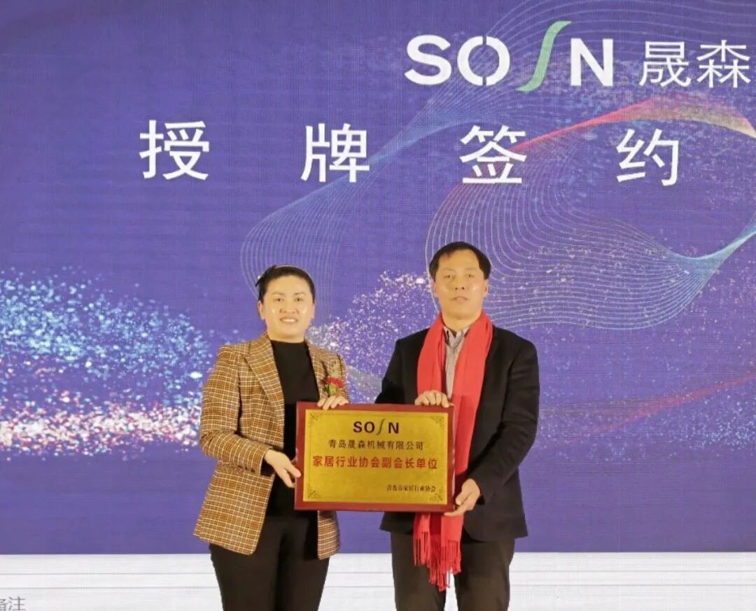 青岛市家居行业协会会长戚振香为晟森机械董事长张建军颁发“青岛市家居行业协会副会长单位”牌匾。