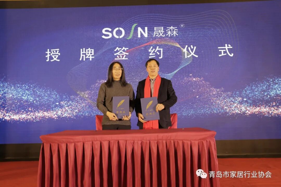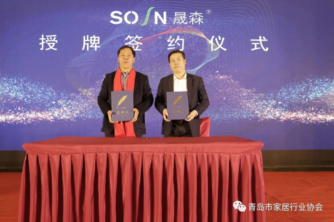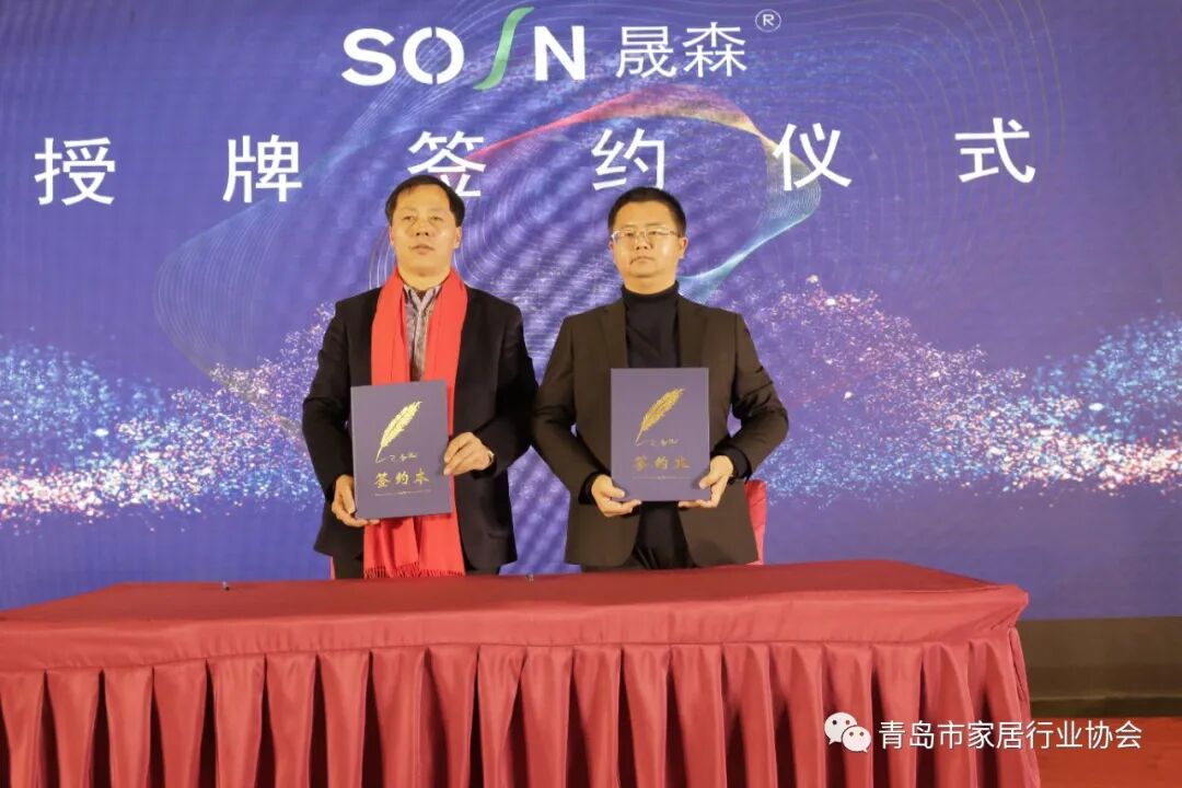 青岛晟森机械有限公司董事长张建军与山东韩师傅家居集成有限公司总经理韩宗利签订战略协议,就智能生产线和自动化设备的采购达成意向。