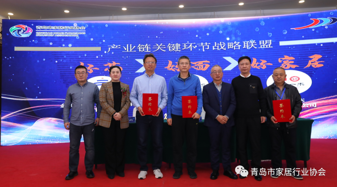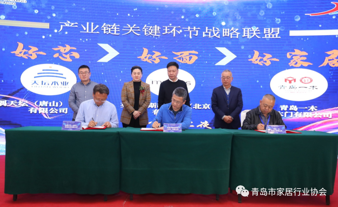 晚宴上还举行了产业链关键环节战略联盟签约仪式,签约单位分别是青岛一木实木门有限公司、英普莱斯新材料(北京)有限公司)、金隅天坛(唐山)有限公司,青岛市家居行业协会研发院院长戴旭杰主持了“大家居产业链”签约仪式。