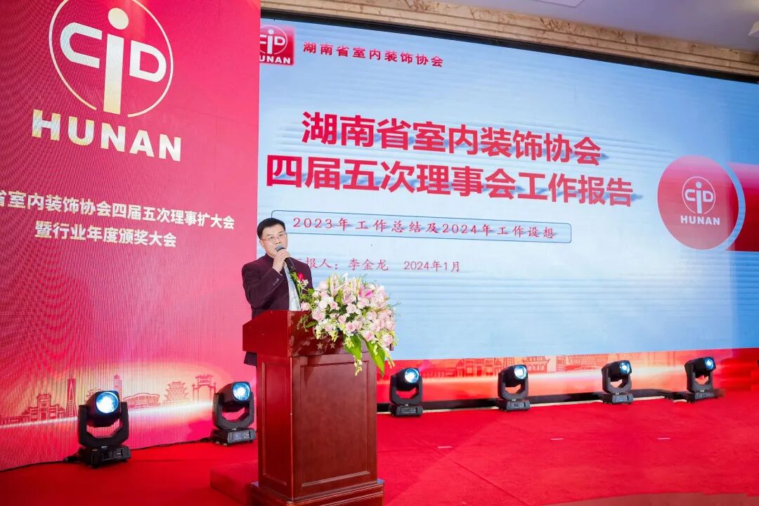 湖南省室内装饰协会会长李金龙代表协会理事会向大会作了2023年工作报告和2024年的工作规划,站在全省装饰行业的高度,总结了行业一年来的成就,和新一年的未来展望,让大家开阔了视野,提振了信心;副会长兼秘书长范桂香向大会报告了协会2023年财务情况并宣布了颁奖决定。
