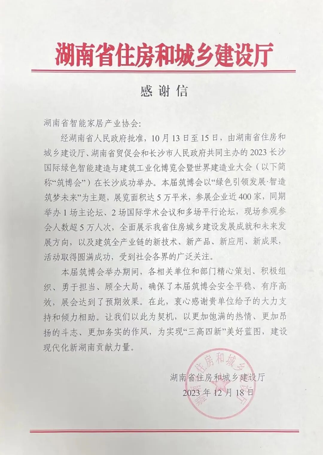 本次筑博会期间协会组织了涵盖智能家居上中下游的代表企业积极参展,将智能家居相关产品和智慧生活整体方案进行集中展示。协会获得2023筑博会“优秀组织奖”的奖项以及收到湖南省住房和城乡建设厅的感谢信,是省住建厅和筑博会组委会对协会组织能力的莫大认可与激励。未来,协会也将积极组织,配合组委会的工作,保证大会平稳有序的开展,与组委会共同营造湖南建筑节能、绿色建筑与智能家居产业氛围,扩大筑博会影响, 为加速湖南省智能家居全产业链的集聚、促进家居智能化建筑绿色化发展、推动智能建造和建筑工业化协同发展贡献力量。