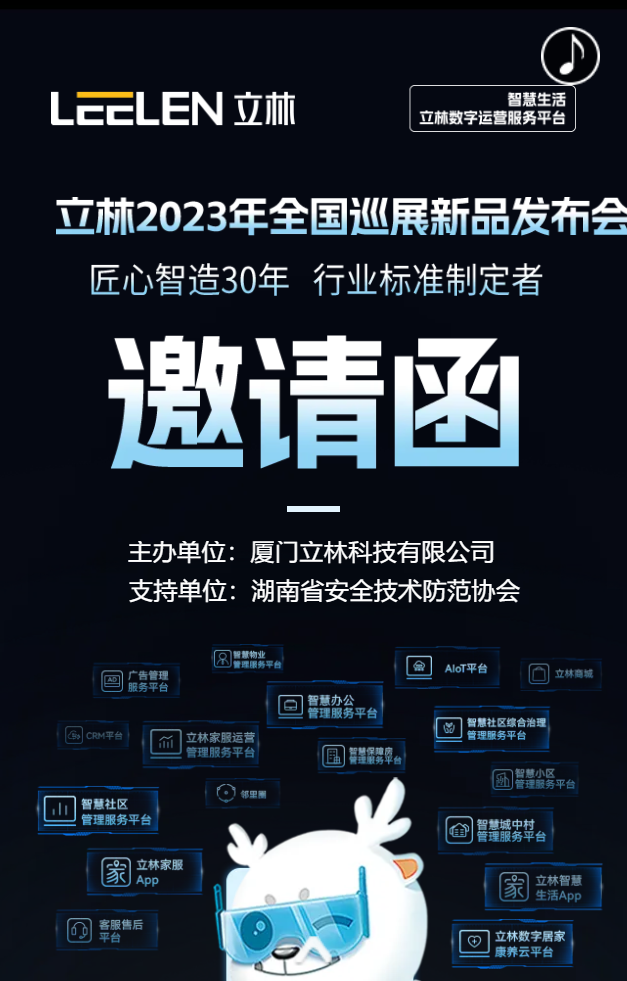 立林2023年全国巡展新品发布会(长沙站)将于2023年11月21日在湖南省长沙市长沙延年城际酒店3F-延玺厅举行,我们将携立林数字运营服务平台,以智慧社区、智慧家庭、智慧康养、智慧办公、智慧酒店等解决方案赋能地产智能化升级,助力物业实现有感服务、无感管理,提升政府现代化城市治理水平,促进安防行业转型发展,与行业共绘新未来,共赢千亿市场。