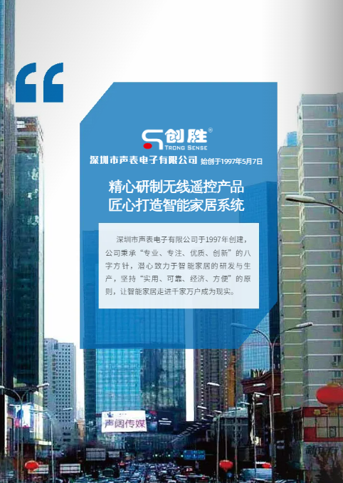 深圳市声表电子有限公司于1997年创建,公司秉承“专业、专注、优质、创新”的八字方针,专注高端面板开关插座、电工、智能化系统技术的研发和制造,潜心致力于智能家居的研发与生产,在业内最早通过ISO9001:2000质量管理体系认证;产品通过“CQC、CE、FCC”认证,获得“中国优秀品牌”、“最具发展潜力领袖品牌”、“深圳知名企业”等多项殊荣。并获批准为国家级高新技术企业。