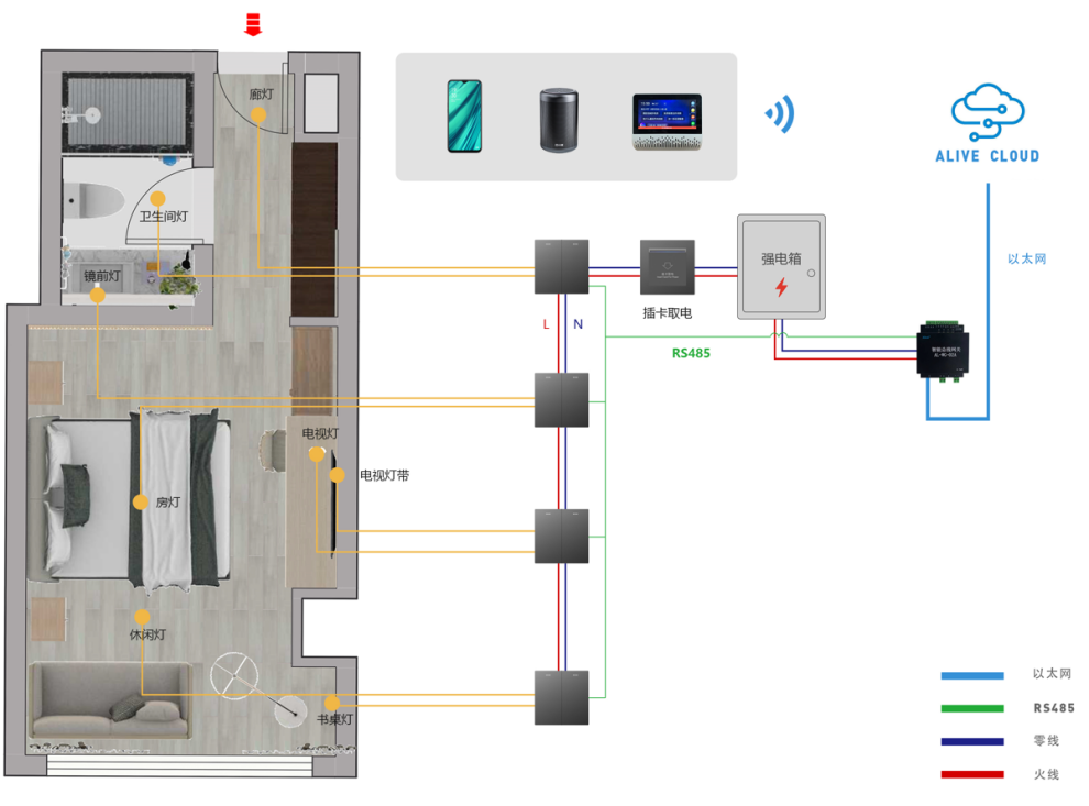 除了带网关的强电485方案外,还有一种插卡取电内置网关的强电485方案,具备网关的全部能力和全部功能,但成本上少了一个硬件设备和对应的一部分布线。所以这个方案在成本上是极具优势的,是目前最具性价比的方案,没有之一。