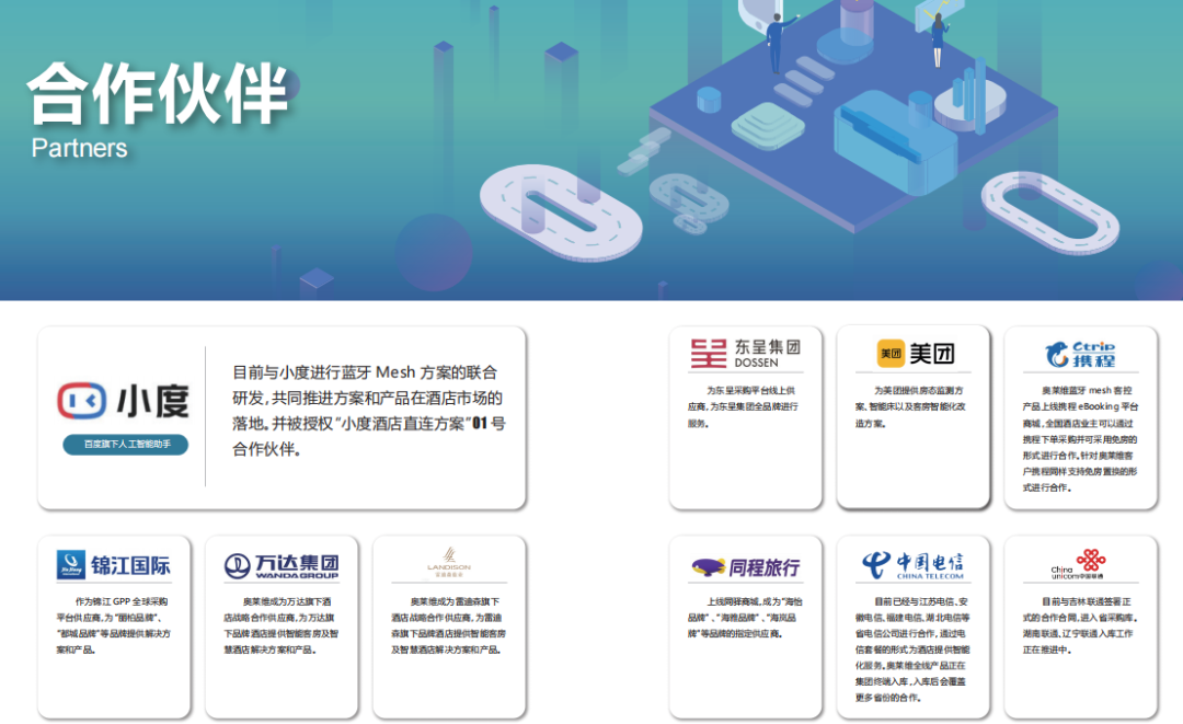 目前市面主流的蓝牙Mesh方案,是由奥莱维与百度公司共同研发的。因此奥莱维是小度蓝牙Mesh直连方案的01号授权合作伙伴。2018年奥莱维成为小度音箱的国代,并且销量第一;不仅如此,奥莱维还是小度音箱的唯一技术支持服务商;同时也是小度增值服务收费的服务商;2021年,与小度联合研发的蓝牙mesh无线方案,成为目前酒店客控行业最主流的客控方案。