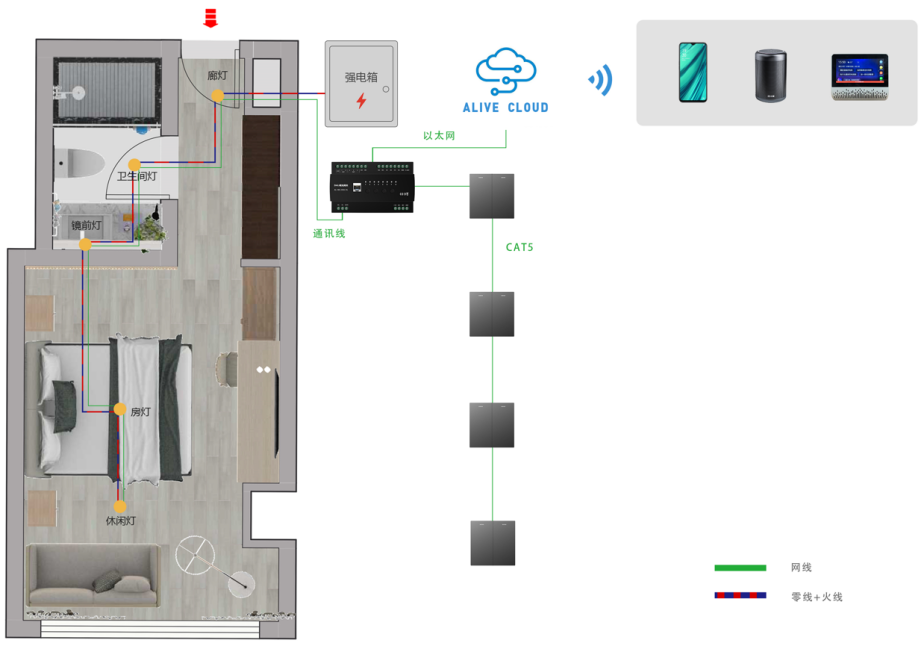 强电485方案的开关面板除了接强电零火线和灯具的控制线之外还要一组485的通信总线。这样既保证了不改变传统的电工施工工艺,又最小限度的使用了通信线。从系统性能和施工复杂度上做了一个最好的平衡。
