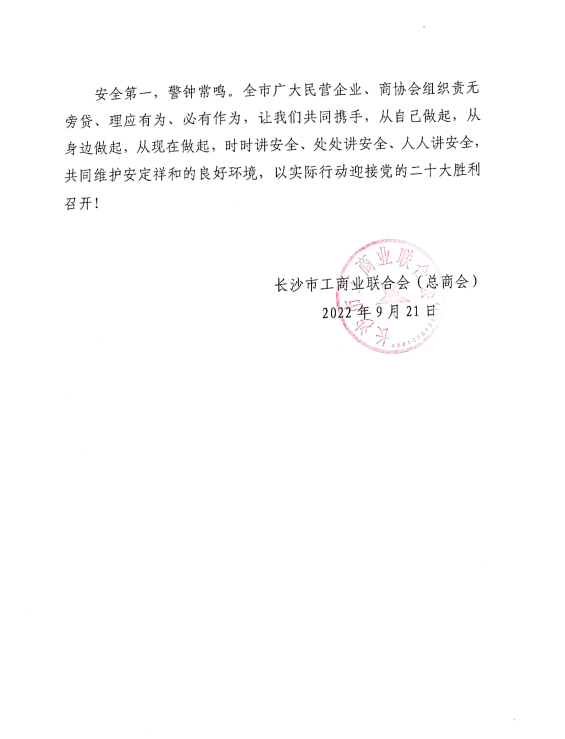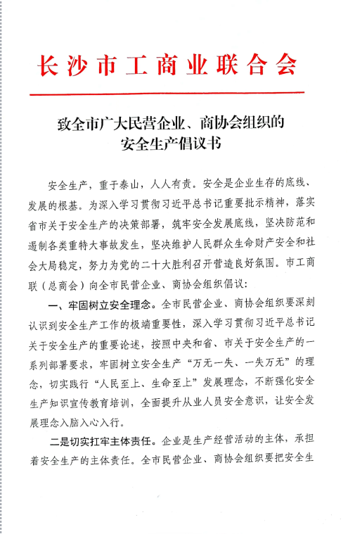 其次,田主席发放了长沙市工商业联合会《致全市广大民营企业、商协会组织的安全生产倡议书》文件,并嘱托协会要抓好“安全生产”工作。田主席强调,协会要组织会员企业,落实省市关于安全生产的决策部署,筑牢安全发展底线,坚决防范和遏制各类重特大事故发生,坚决维护人民群众生命财产安全和社会大局稳定。