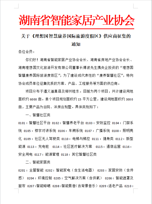 【协会动态】关于《理想国智慧康养国际旅游度假区》供应商征集的通知!