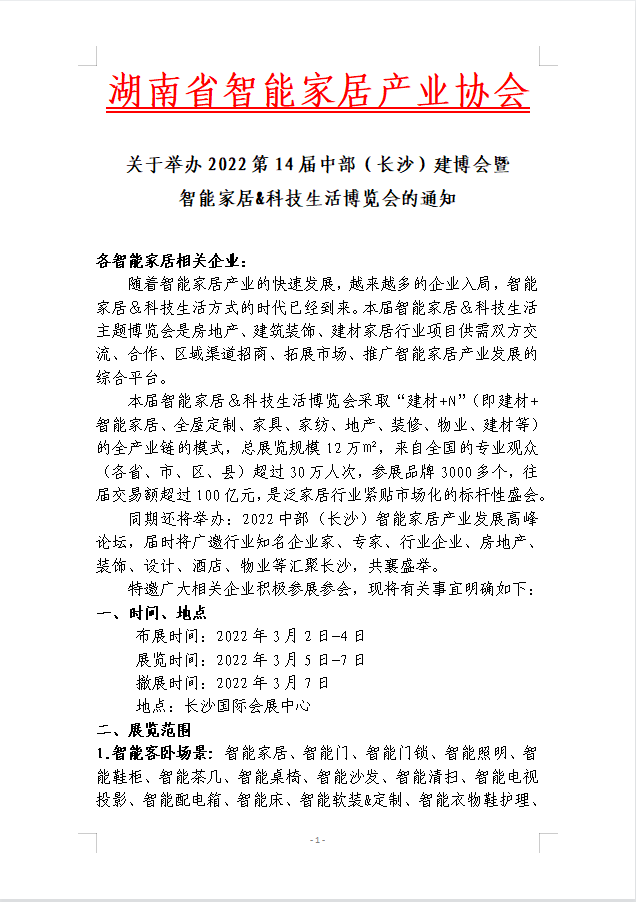 【协会动态】2022第14届中部(长沙)建博会暨智能家居&科技生活博览会--招展工作正式启动