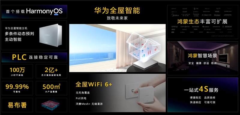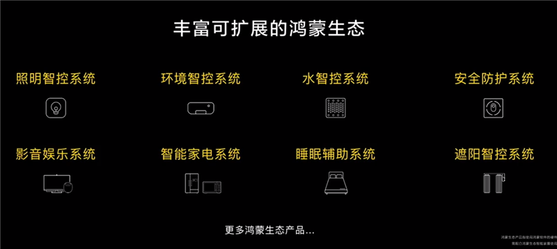 最后的“N”,则是指N种系统。消费者在建设属于自己的智慧家庭的时候,往往会有不一样的需求,为了满足用户多样化需求,华为全屋智能解决方案还提供了丰富可扩展的鸿蒙生态配套系统,包括照明智控系统、安全防护系统、环境智控系统、水智控系统、影音娱乐系统、睡眠辅助系统、智能家电系统、遮阳智控系统等N大系统。鸿蒙生态将持续丰富扩大,未来系统将会越来越多,就目前实例讲,华为全屋智能已经可以实现恒温、恒湿、恒净、恒氧,节律照明等智慧舒适体感。与此同时,华为也在积极拓展合作伙伴,目前已达1000+大品牌。