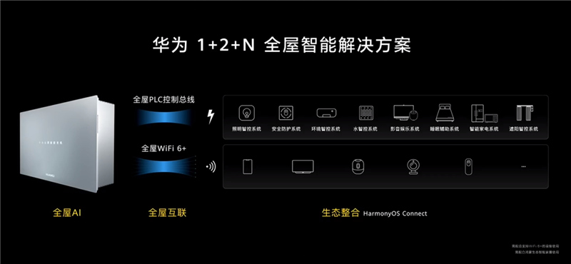 发布会现场,在余承东的带领下,华为诠释了“全屋智能”的真正面貌 ——以“1+2+N”的形式,给家庭装上一个搭载鸿蒙OS的“智慧大脑”,结合两张网对全屋生态进行整合,攻克三大难题,实现稳定、高效、丰富的全屋智能用户体验。