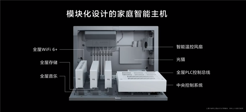 其中,“1”指的是华为全屋智能主机。全屋智能主机采用的是一颗双核凌霄芯片,搭载面向IOT领域的HarmonyOS中央控制系统,采用模块化设计,相当于一个集学习、计算、决策于一体的智慧中枢,让它能够轻松取代并重构传统弱电箱,其中的中央控制系统内搭载了AI芯片,实现了端到端的全屋AI和全屋互联,让家拥有“可成长”的智慧大脑,安心更安家。