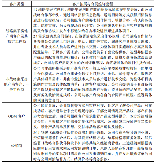 因产品为房地产项目弱电工程中的金额较小的一部分,未采取集中采购模式 的房地产商通常由其工程商采购楼宇对讲产品。因房地产开发项目分布在全国不同的地区,一般贸易商通常在区域内具有一定的项目资源,通过转卖给工程商获取收益,因此,公司的一般工程商和一般贸易商客户分布通常具有地域性,且较为分散,采购金额一般较小。因此,公司对于上述客户主要采取款到发货的结算模式。对于采购金额较大的大中型房地产项目的工程商,公司采取收取0—50%的预收款,剩余款项货到验收后1-3月内收款的结算模式。此外,公司将签署战略合作协议的经销商作为开拓销售渠道的重要补充形式,并与之建立了长期的合作关系。鉴于此,公司对上述经销商采取发货前收取60%-100%的预付款,剩余款项在到货验收后1-3月内收取剩余款项的结算模式。
