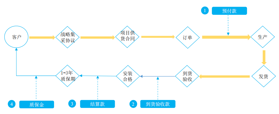根据战略集采协议或项目供货合同的要求,公司对房地产商客户通常采用“预付款—到货验收款—结算款—质保金”的结算模式。具体情况如下图: “预付款”在具体销售合同签订后一定时间内收取,收取比例通常为合同金额的0-35%;“到货款”在发货并验收合格后收取,至到货款收取后的累计收款比例通常为合同金额的60%-90%;“结算款”在公司销售的产品安装合格并在项目预算后收取,至结算款收取后的累计收款比例通常为合同金额的95%-100%;“质保金”在质保期到期后收取,通常为合同金额的0%-5%。公司与客户约定在到货验收后1-3个月内支付到货款,产品安装合格并在项目结算后1-6个月内支付结算款,在质保期满后1个月到1年内支付质保金。