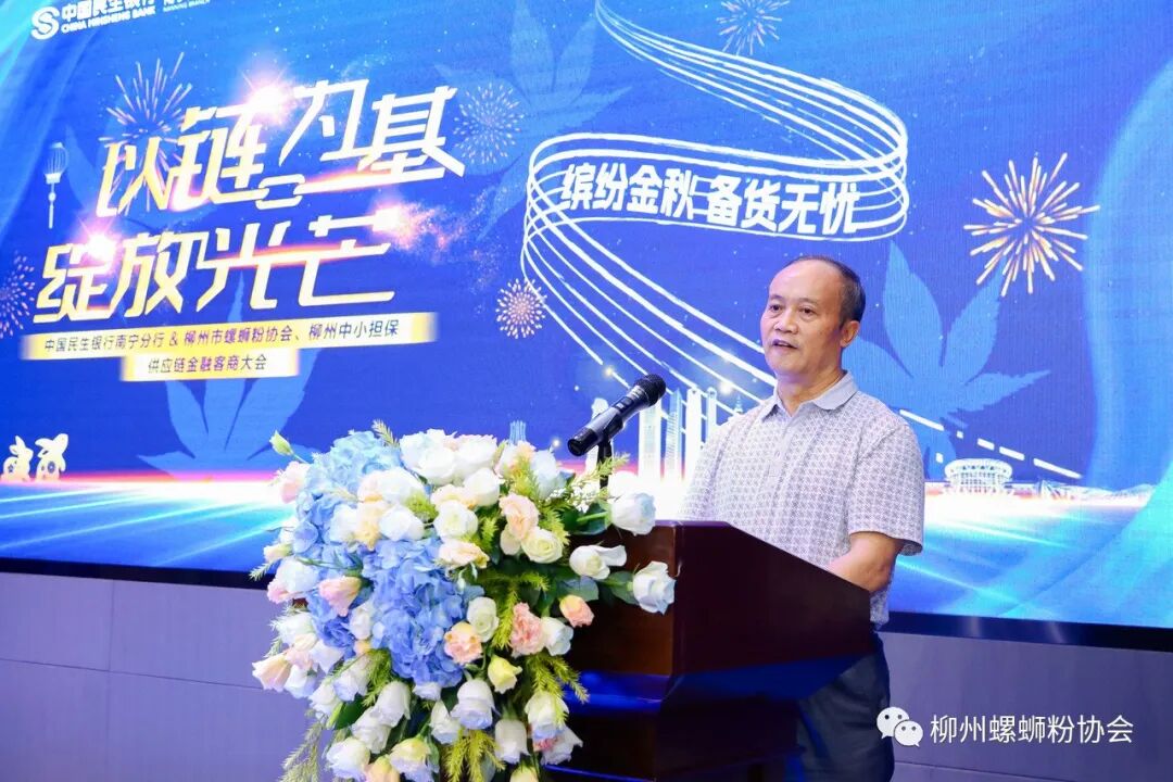 柳州市螺蛳粉协会会长唐机文对民生银行举办此次活动表示感谢,同时介绍了柳州螺蛳粉产业目前存在的问题与困难,期望双方合作取得丰硕成果。