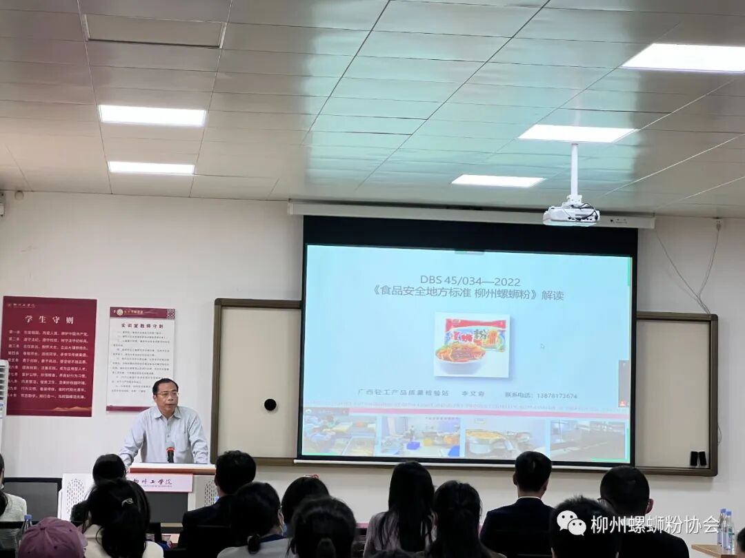 本次宣贯活动邀请了广西轻工产品质量检验站副站长李文奇高级工程师、广西计量检测研究院徐传杰高级工程师、柳州市标准技术和知识产权研究中心科长何彬斌高级工程师作为宣贯专家,从标准制定的角度,现场讲解了DBS45/034-2021《食品安全地方标准柳州螺蛳粉》、T/LZLSF 003-2022《地理标志证明商标柳州螺蛳粉》、T/LZLSF 004-2022《预包装螺蛳粉生产质量控制技术规范》等三项柳州螺蛳粉地方标准和团体标准。柳州工学院副校长郑燕升、食化学院院长熊建文、食化学院部分教师代表也到场参加。