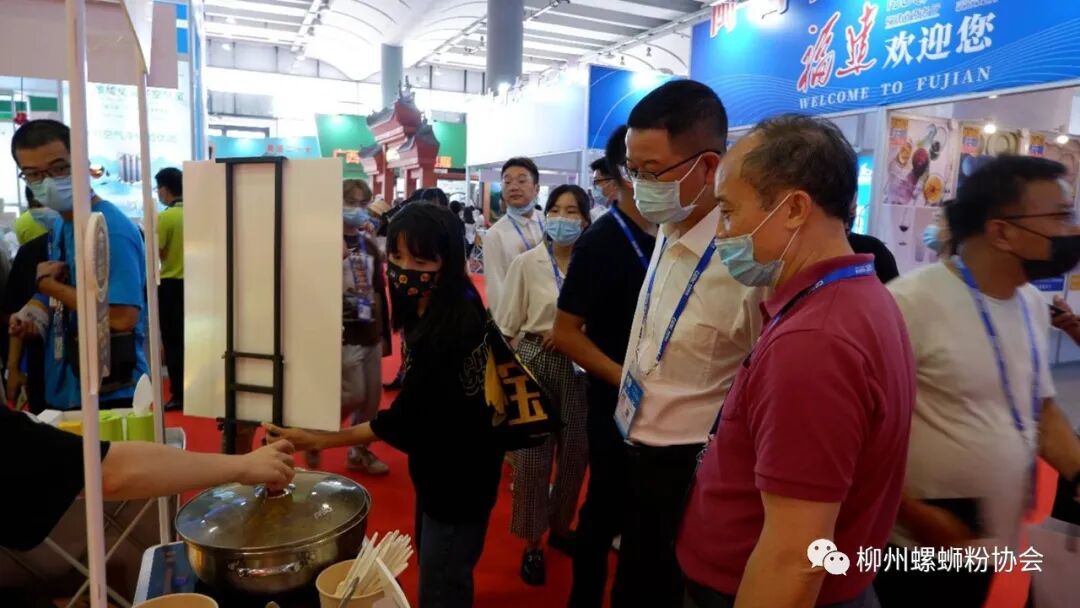 (参展人员在排队试吃柳江人家螺蛳粉)