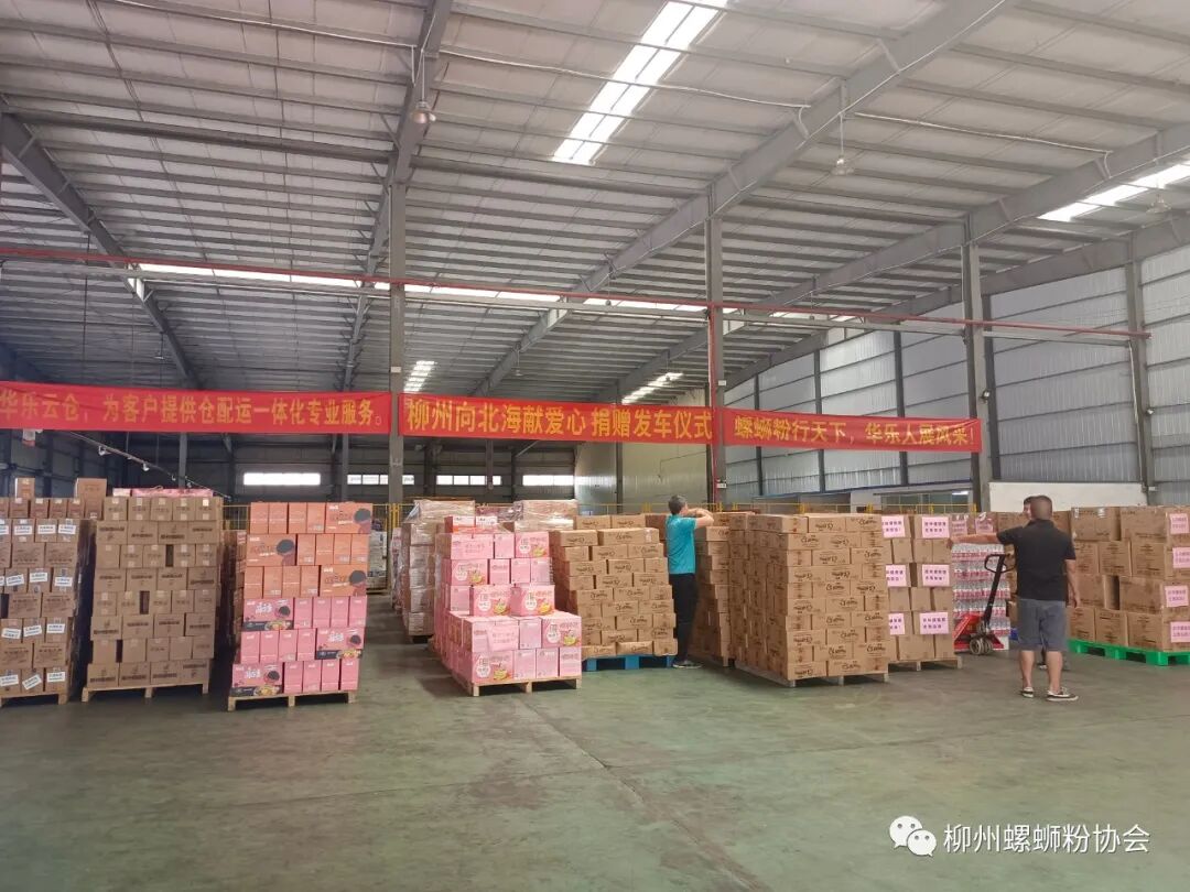 2022年7月27日下午16时,柳州市商务局、柳州市红十字会和柳州市螺蛳粉协会在柳江区华乐物流园E栋举行“柳州螺蛳粉向广西北海市驰援发车仪式”。本次活动由市红十字会党组成员、副会长朱政主持,柳州市商务局副局长贾建功,柳州市螺蛳粉协会会长唐机文到场并发表致辞。参与捐赠的26家爱心企业代表共同参与了本次发车仪式。本次爱心捐赠共募集到5万包柳州螺蛳粉及方便食品,共价值约73万元。