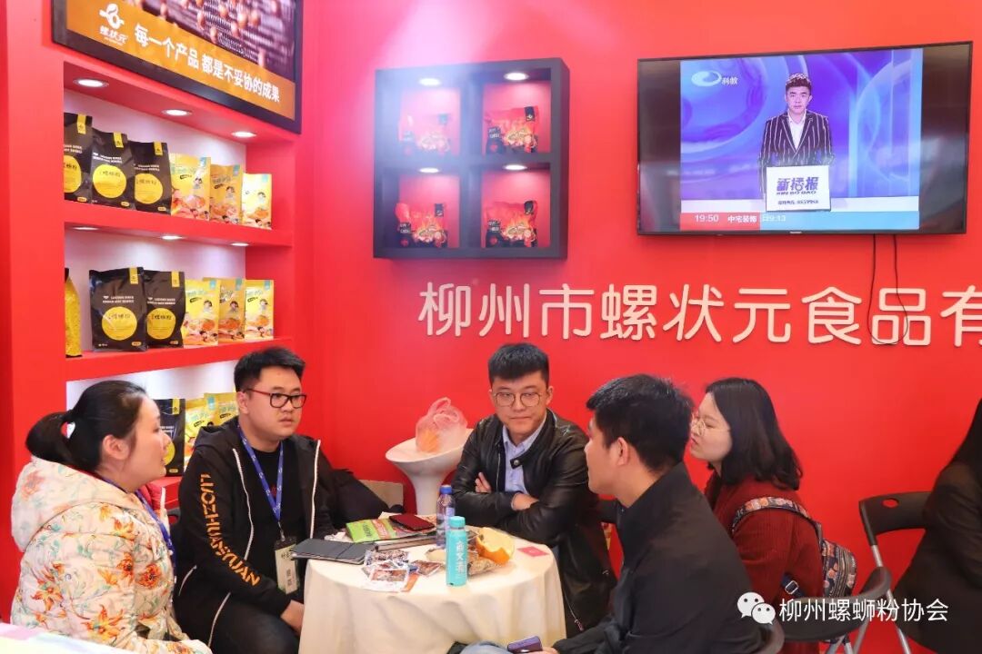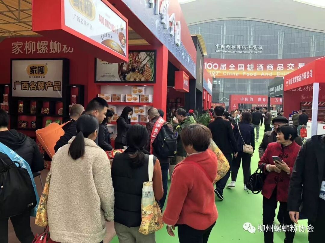 2019年3月21-23日,由中国糖业酒类集团公司和成都市人民政府主办的第100届全国糖酒商品交易会在四川省成都市中国西部国际博览城举行。在柳州市商务局的统一组织部署下,柳州市螺蛳粉协会协助组织嘻螺会、好欢螺、家柳、螺霸王、卷味、黄氏真味、佳味螺、螺湘百味、百真汇、柳全、螺状元等11个螺蛳粉品牌商家进馆参展。开馆当日,柳州螺蛳粉展馆特别抢眼,参展的11家螺蛳粉企业的展位人潮如涌,到访的顾客络绎不绝,在整个展馆中显得尤为火爆。开馆的第二、三天,柳州展馆持续走红,备受商家和顾客青睐,到展位洽谈加盟、代理合作、品尝螺蛳粉的商家和观众风涌不断。据初步统计,参展三天,柳州螺蛳粉展馆现场签约加盟商、代理商232家,签约总额899万元;达成意向签约加盟商、代理商1506家,达成意向签约额2.33亿元;现场零售螺蛳粉约37万元;现场接待国内外专业客商1.15万人次,采购商和消费者约3.5万人次参加了试吃体验活动;进馆人流量约12.8万人次。可以说,本届糖酒会柳州螺蛳粉参展企业取得丰硕成果,满载而归。