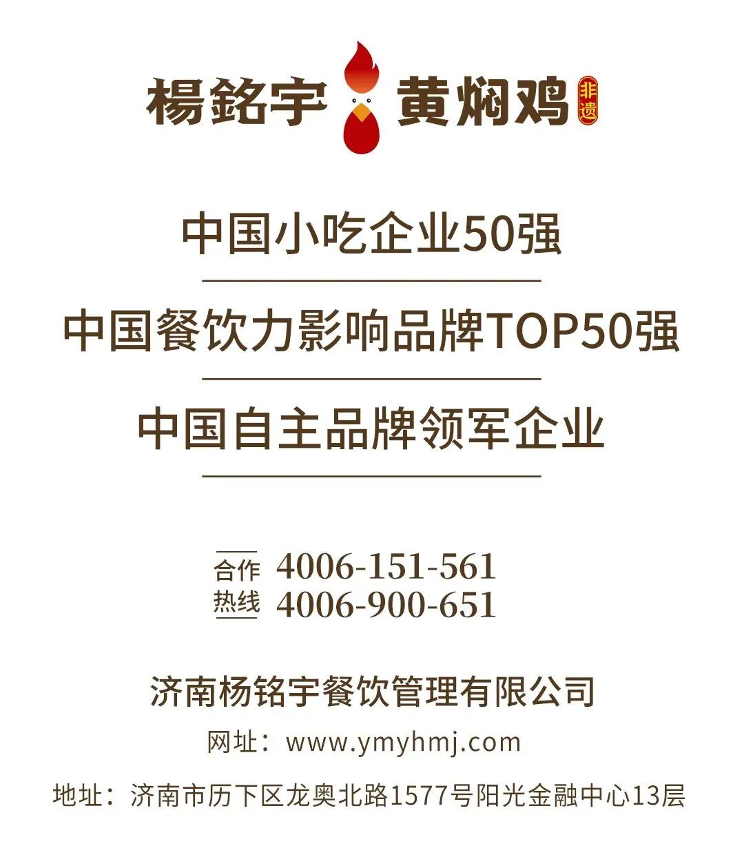 “杨铭宇”作为中国黄焖鸡品类的创始品牌,凭借厚重温润的鲁菜文 化底蕴和成熟的连锁加盟机制,现已发展成为中国小吃行业的领导品牌。“中华风味名吃”、“中国餐饮连锁加盟著名品牌”、“中国餐饮名店”、“中国餐饮门店规模第一品牌”。