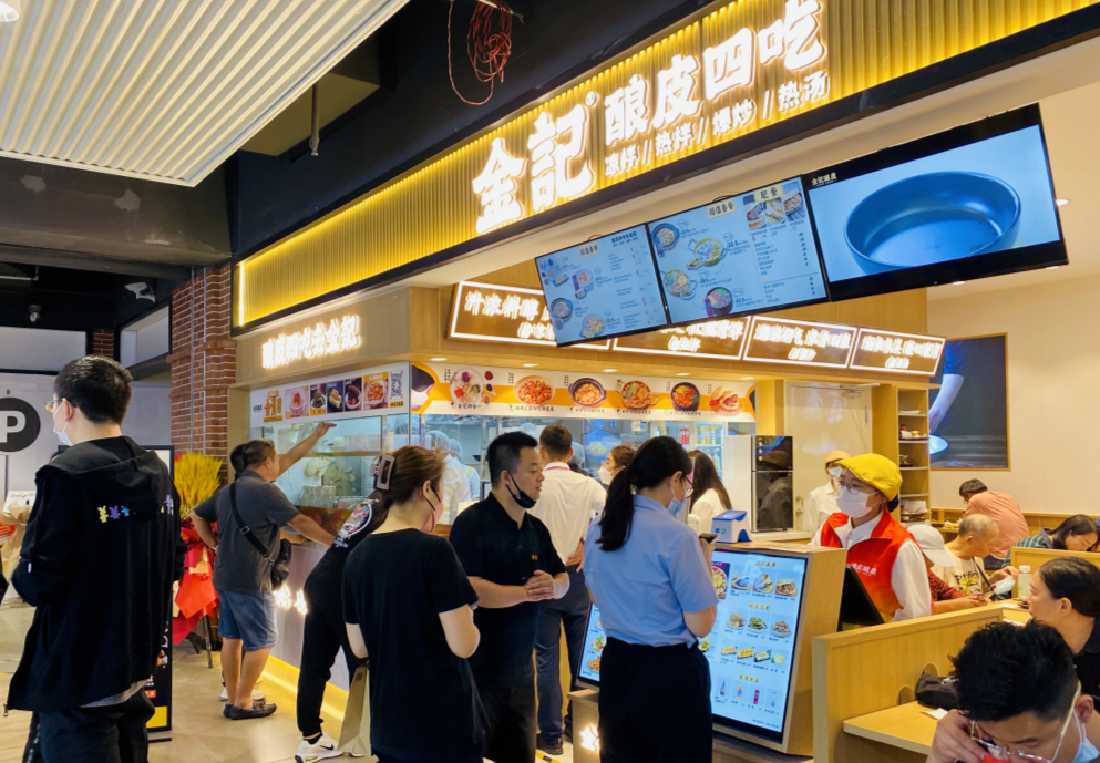 与传统酿皮店装修不同,金记酿皮采用原木色调的简约几何空间设计,彰显食物暖意,明档厨房,全透明操作,带给顾客最直观的互动感,更符合现在主力消费群体的风格偏好。门店配备专属定制酿皮设备,1㎡可满足万元店。制作流程的标准化,出餐流程的规范化,让门店操作环节更简洁,大大减轻了门店对厨师的依赖性。无论是凉拌,热拌,爆炒,还是热汤,出餐速度可以在5分钟内完成,还能做到锅气十足,让更多人吃快餐,想酿皮,吃酿皮,到金记。