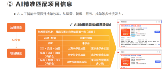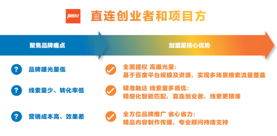 1、加盟星有创业者:海量用户通过百度获得加盟信息,随时随地触发加盟代理需求,为入驻品牌提供大量商机;