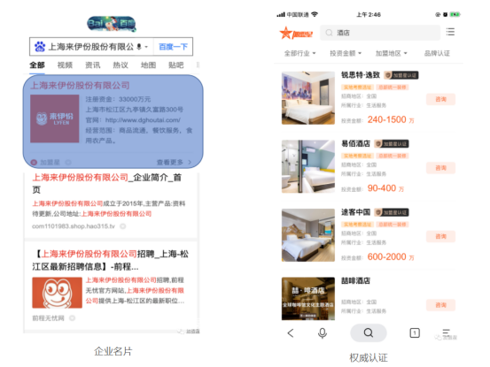 除了丰富的项目数量,创业者最需要的是真实可靠的项目信息。加盟星依托百度的权威认证体系,入驻成功的项目将由加盟星认证并出具认证报告并打上项目认证标识,凸现精选品牌价值,强化用户认知;会员企业也将获赠企业名片,用户搜索企业全名时,搜索结果前列展现会员企业专属认证,增强创业者信任。