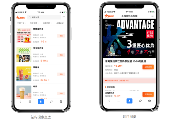 通过一键打通搜索,创业者在搜索某个品类的加盟信息时,入驻加盟星的该品类品牌可显示在搜索前列,并在加盟星首页获得推荐,创业者可直达站内搜索页面并点击项目进行浏览