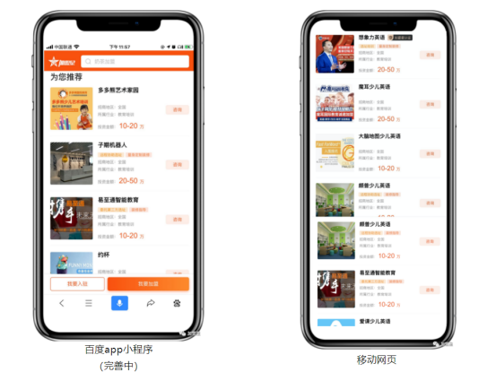 品牌一次入驻,即可同时在PC、移动、APP多终端全方位精准推送创业者。与此同时,获得百度生态平台全场景营销凝心聚力,现阶段已上线搜索专属特制卡、SEO结果和加盟星主站,信息流广告、百度短视频、百度贴吧、百度知道等渠道不断接通中。