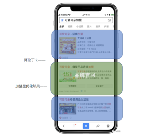 入驻加盟星的品牌将获得专属特型阿拉丁卡,展示在百度搜索自然结果的前列,体现了加盟者最关心的信息是否可加盟代理、所属行业、加盟费用等,缩短用户搜寻路径,是品牌形象的第一窗口。
