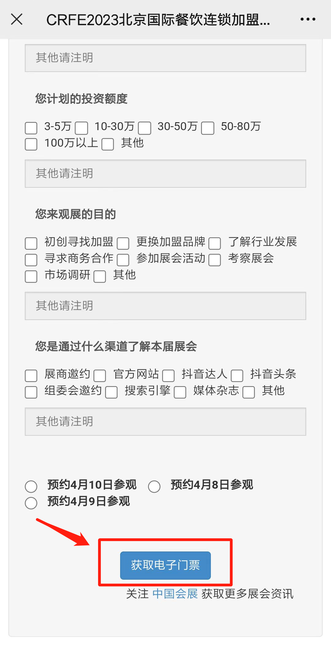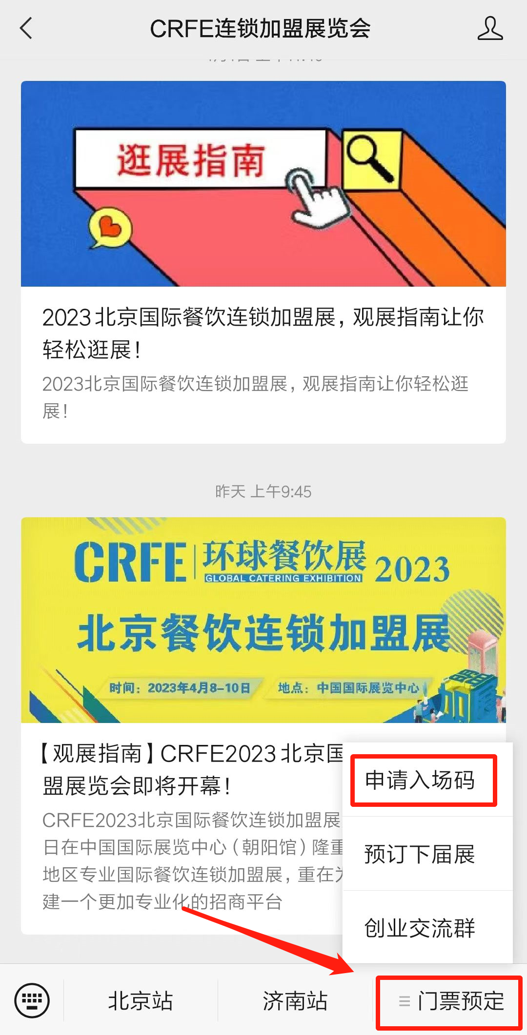 第二步:进入CRFE连锁加盟展览会公众号界面,点击“门票预订-申请入场码”。
