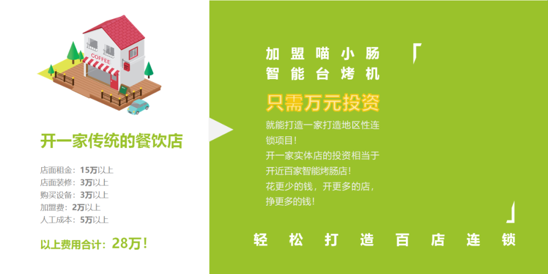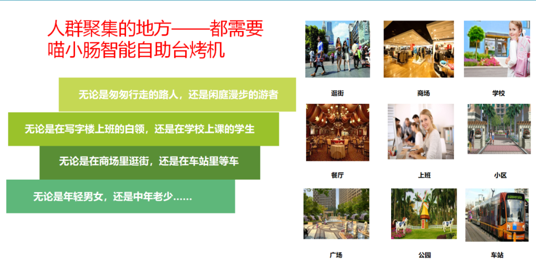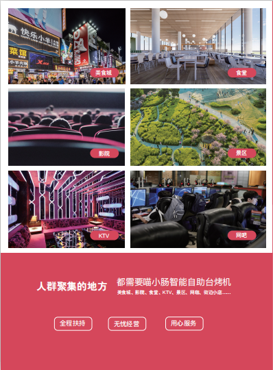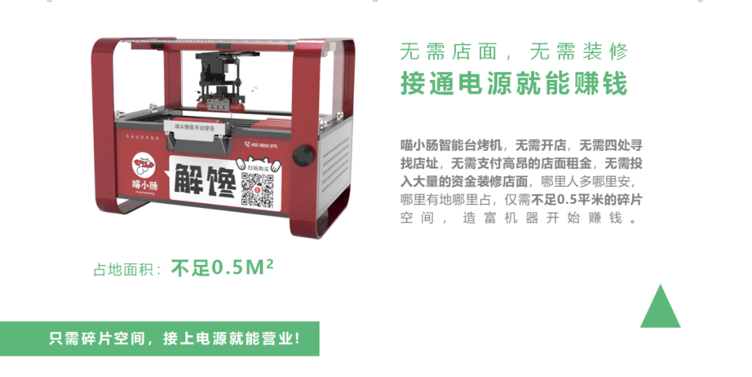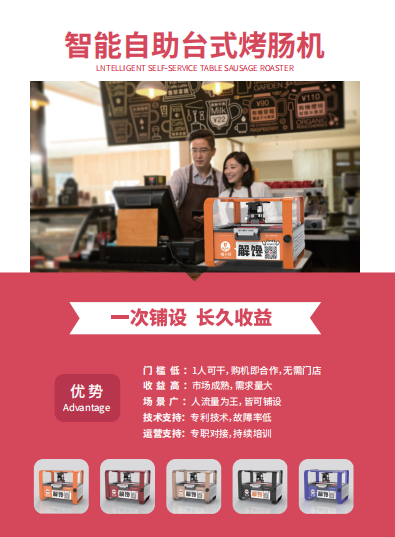 无论是商场、游乐场、电影院,还是机场、地铁站、火车站、汽车站,无论是医院、学校、公园,还是写字楼、社区、便利店,只需要不足0.5平米的碎片空间,即可开一家专业的智能烤肠店