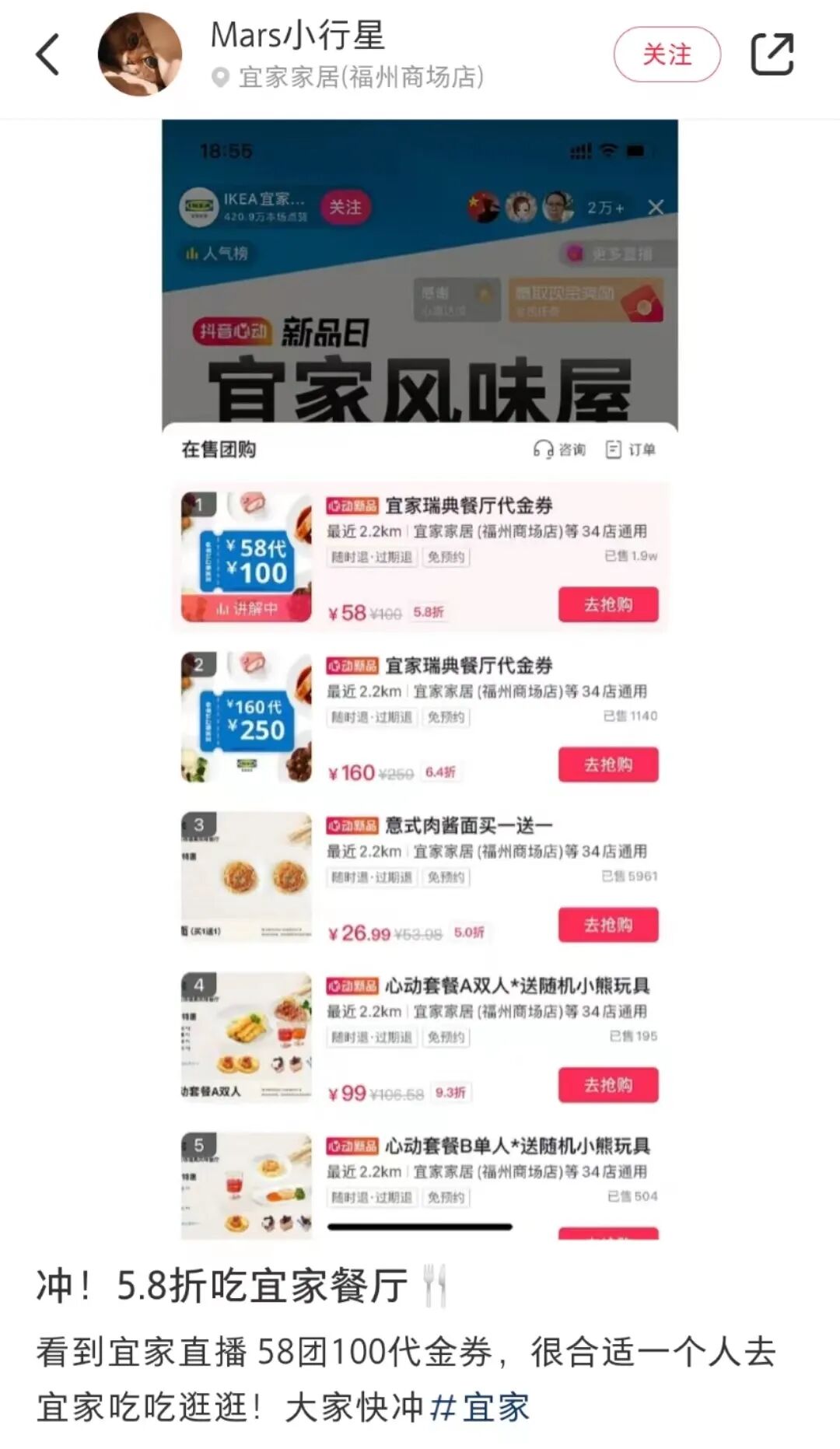 在之前的直播中宜家推出了58抵100元代金券等优惠券。
