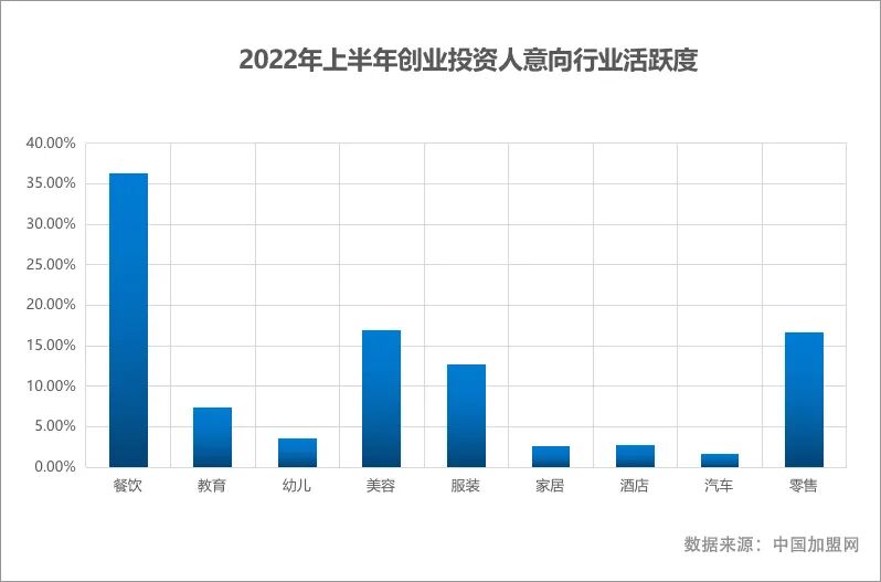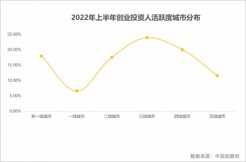 从加盟项目咨询情况来看,2022年上半年创业投资人的创业热情骤减,加之各地疫情防控政策的限制,使得外出考察受限,这就导致了很多连锁品牌加盟业务发展放缓,从数据中我们不难看出,1月、2月、3月,创业投资人的活跃度与往年差距不大,到了4月、5月活跃度下降明显,随着6月国内疫情得到有效的控制后,这一数据开始快速攀升。