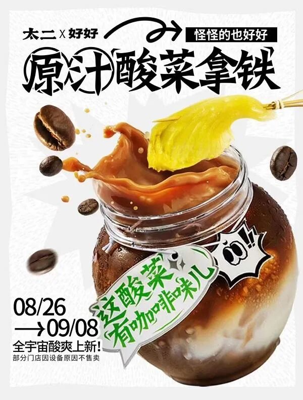 最近太二又搞出了事情,8月25日,太二酸菜鱼在公众号发文称,品牌推出的新品酸菜咖啡-原汁酸菜拿铁,并于8月26日-9月8日在全国上市。将咖啡与酸菜脑洞的结合在一起,想想就觉得上头!