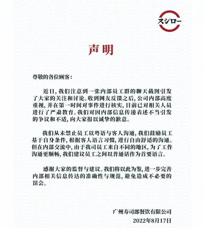 8月17日,寿司郎发布声明称,近日,公司注意到一张内部员工群的聊天截图引发了网友的关注和讨论。对此,公司内部高度重视,并在第一时间对事件进行核实,目前已对相关人员进行了严肃教育,对因内部信息传递表述不当引发的争议和不适,向大家报以诚挚的歉意。
