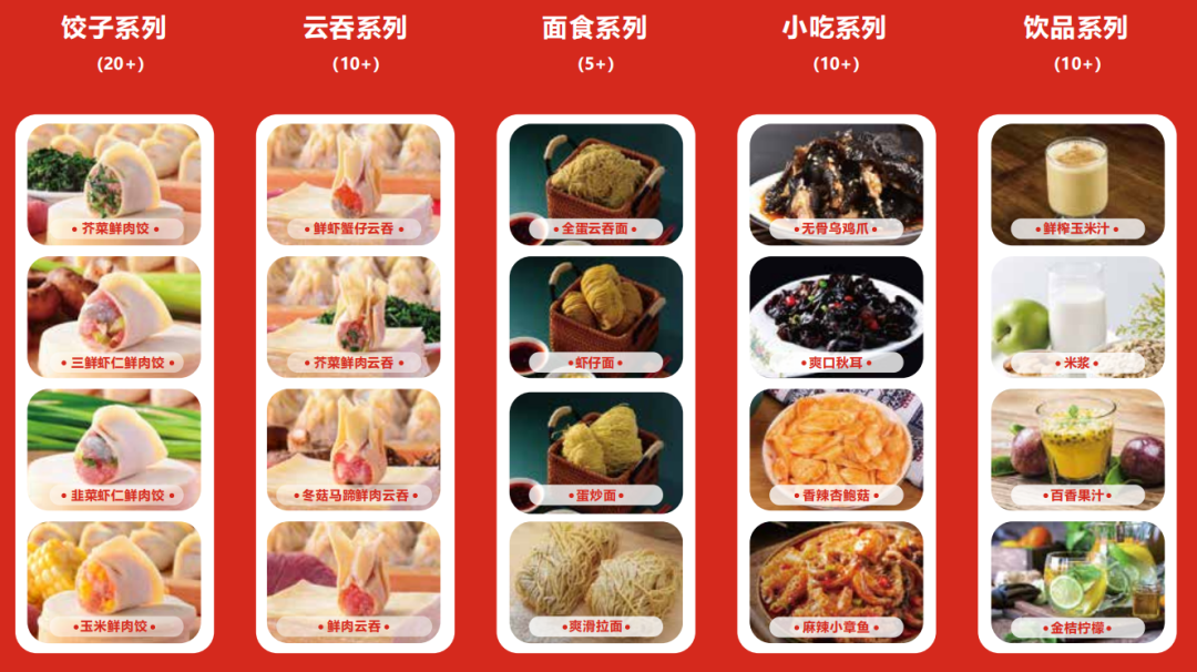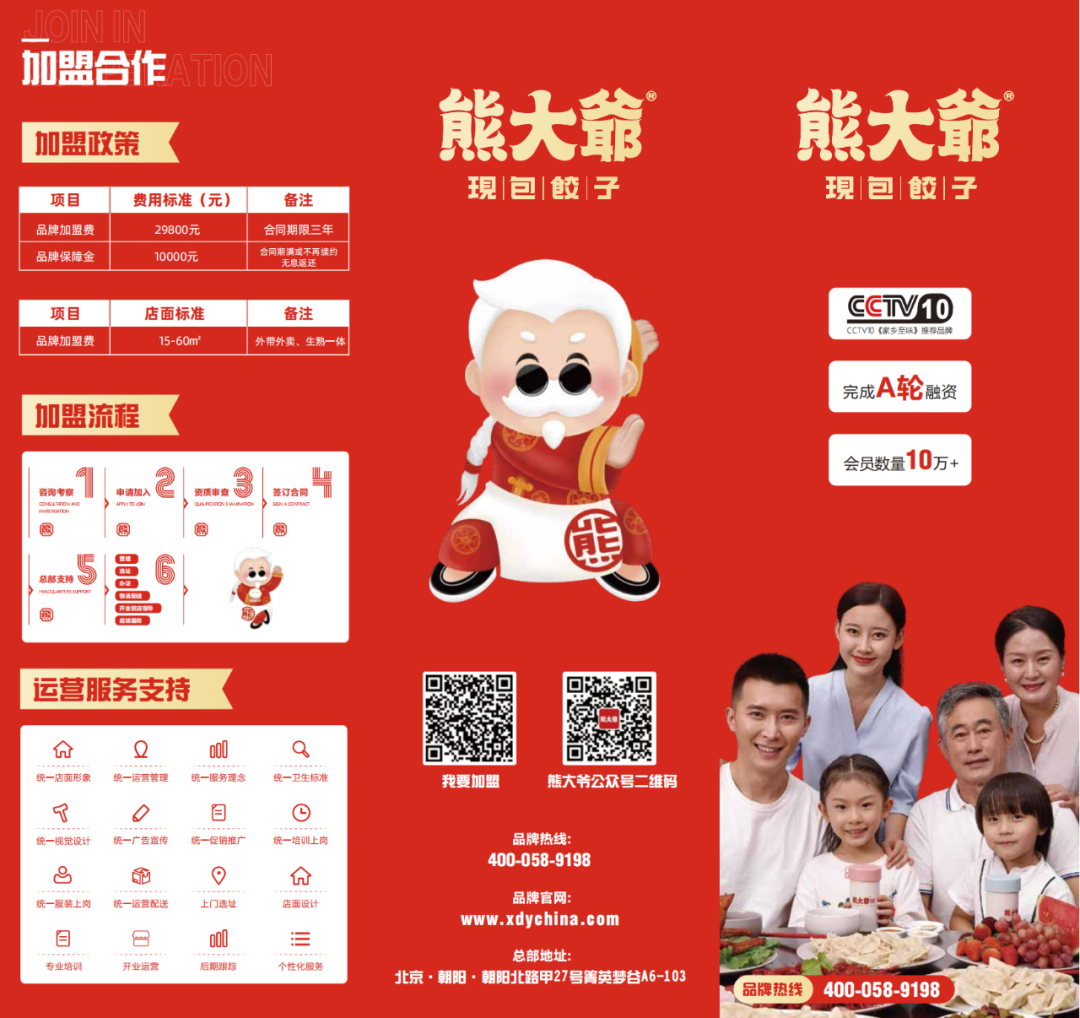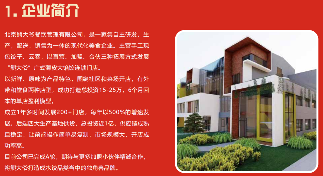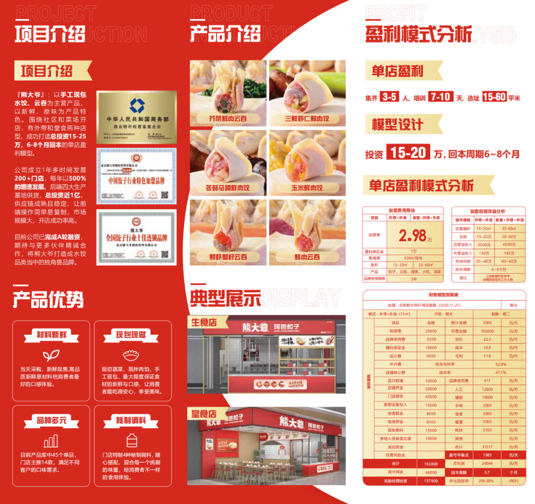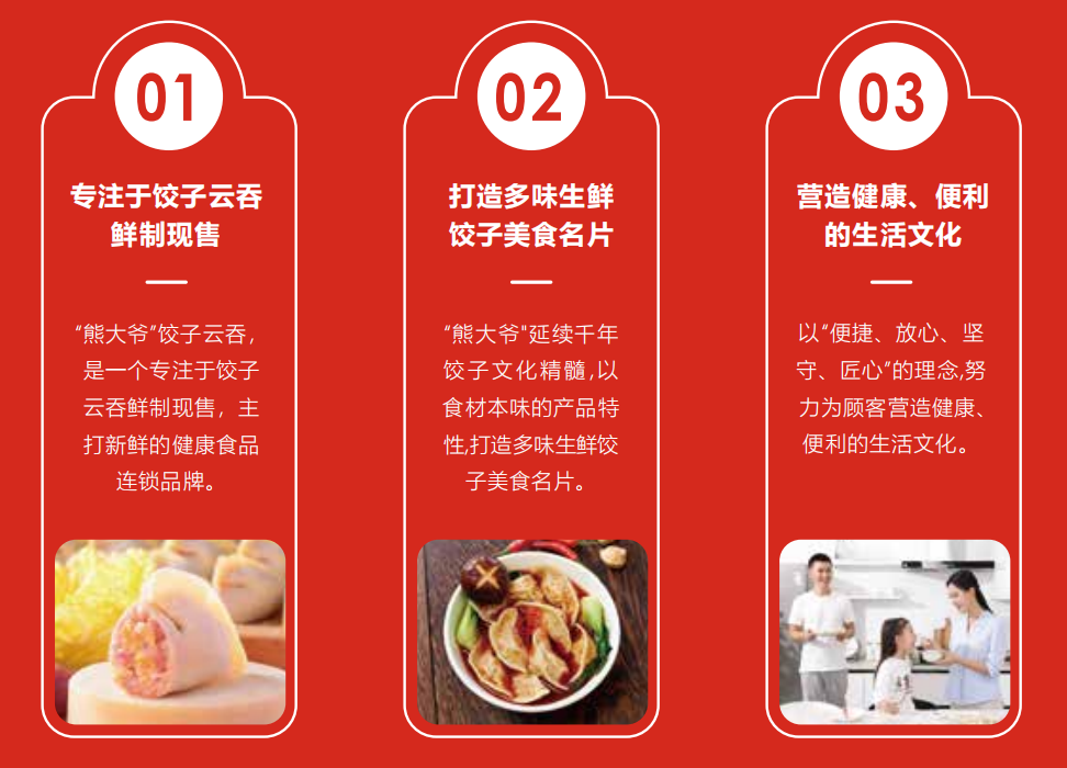「熊大爷」主营手工现包饺子、云吞,以直营、加盟、合伙三种拓展方式发展 “熊大爷”广式薄皮大馅饺连锁门店。以新鲜、原味为产品特色,围绕社区和菜场开店,有外带和堂食两种店型,成功打造总投资15-25万,6个月回本的单店盈利模型。