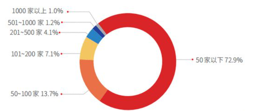 关于餐饮连锁加盟,值得注意的是,《中国餐饮品类与品牌发展报告2021》显示,餐饮品牌数门店在50 家以下的品牌占比为 72.9%,而门店在 200 家以上的品牌占比仅为 6.3%。可见,餐饮行业中中小品牌梯队目前还拥有着非常庞大的数量,行业连锁化的程度还有待提高,连锁+开店的实现空间所见良好!