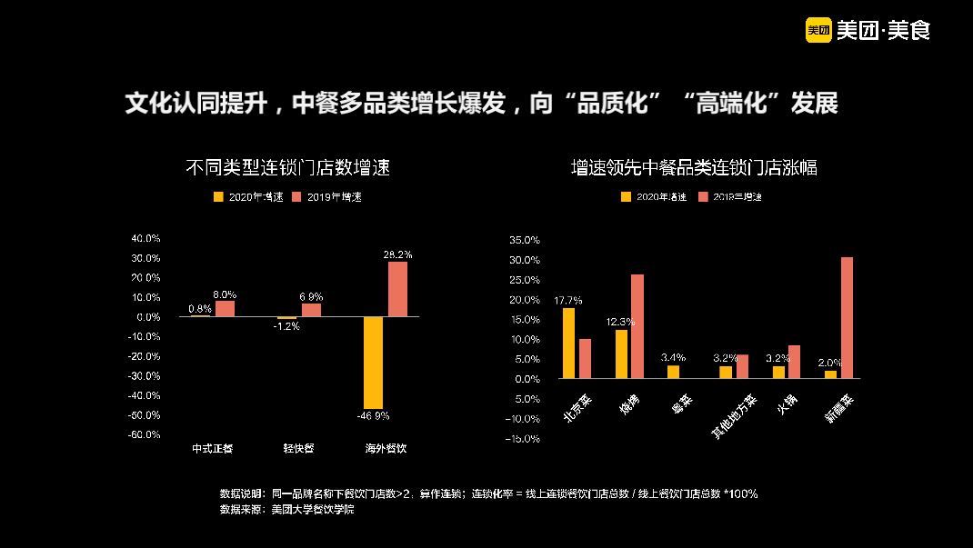 2020餐饮企业连锁化率同比增幅前十品类中,中餐占据了六成以上,其中北京菜以17.7%的涨幅位居第一。同时,中餐品类也加速朝着“品质化”“高端化”的发展方向迈进。