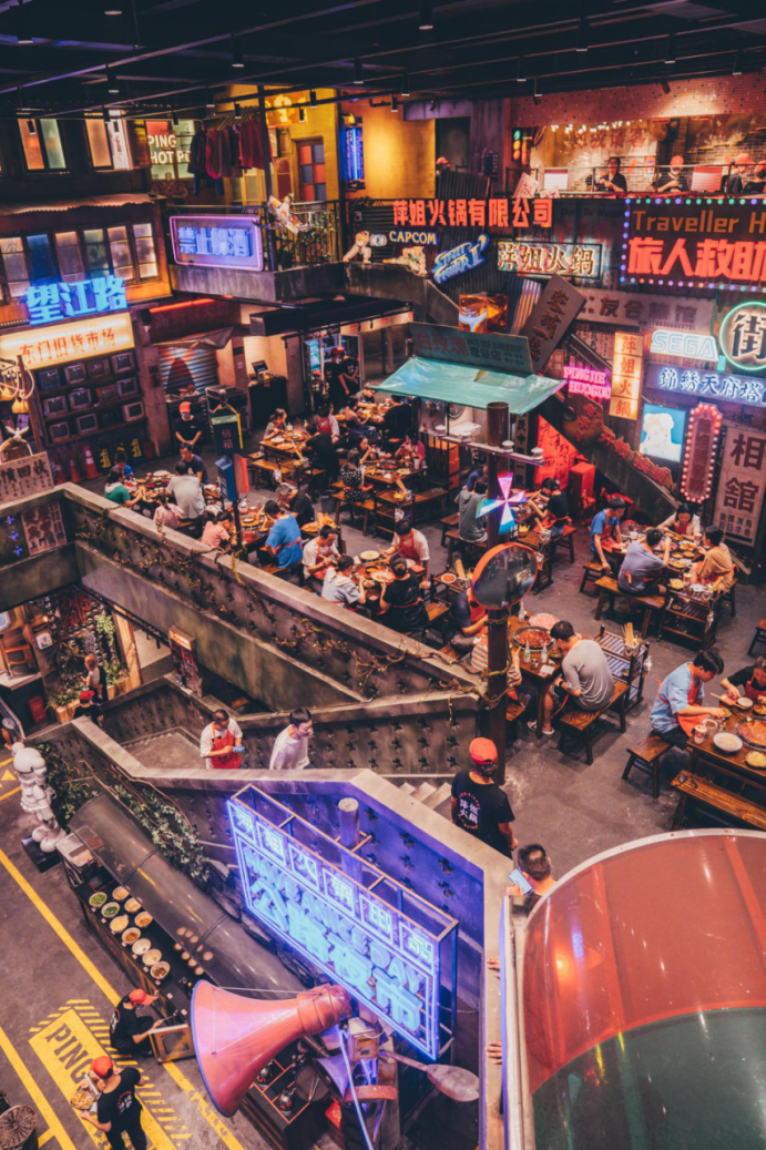 萍姐火锅开在重庆观音桥的千平大店,1:1还原了重庆老城风貌,进入门店,宛如进入时光隧道,一秒穿越80年代的老重庆。