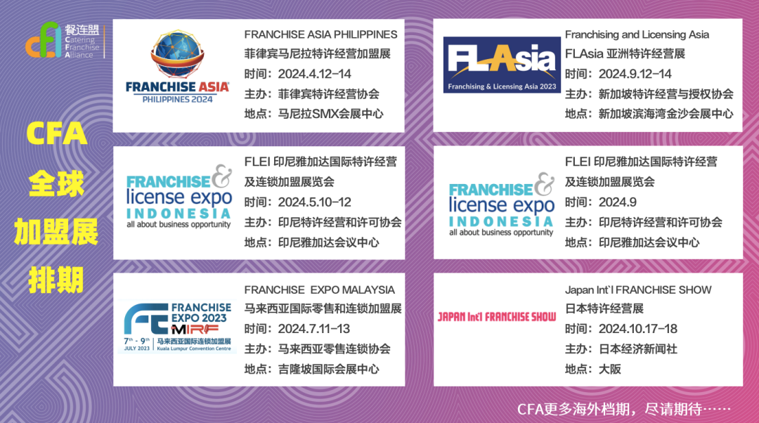 【CFA海外加盟展】排期:4月菲律宾、5月印尼、7月马来西亚、9月新加坡、10月日韩